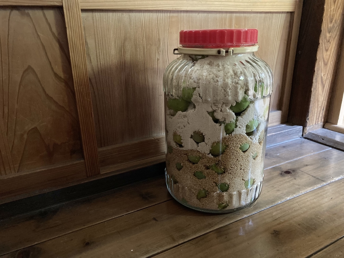 前回は大粒の梅が2.5kgで瓶がいっぱいになりましたが、今年は小梅も混ざっているので3kg入りました。